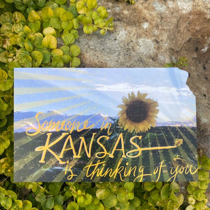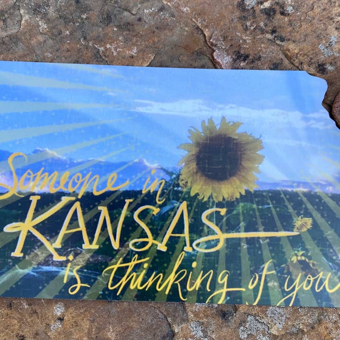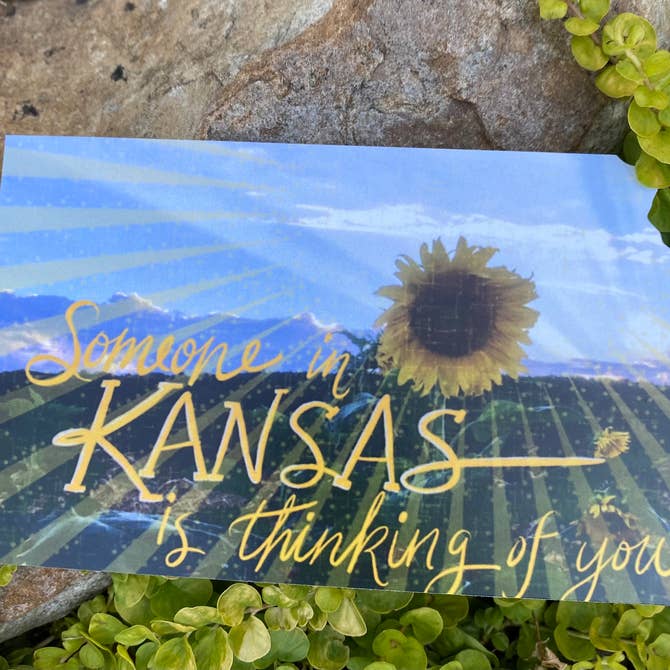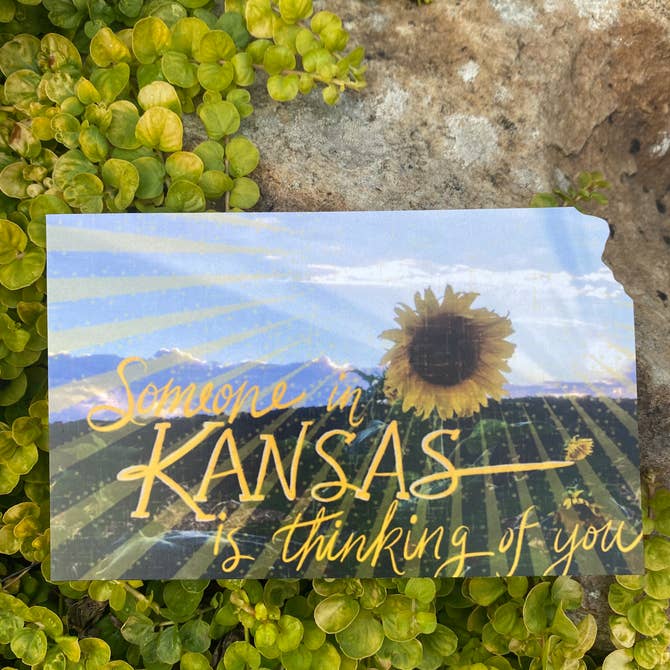 More than a basic postcard, this Kansas postcard is also die cut in the shape of Kansas. This photo was taken in a sunflower field south of Lawrence just before sunset. Send a little love from Kansas and a few rays of sunshine with this cheerful postcard and message “Someone in Kansas is Thinking of You”