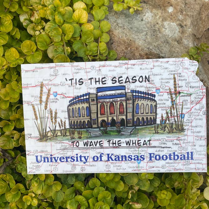 More than a basic postcard, this Kansas postcard is also die cut in the shape of Kansas. This postcard has a map of Kansas as a full background, but the University of Kansas Football Stadium is the focal point. The words ‘tis the season to Wave the Wheat-University of Kansas Football frame the stadium.