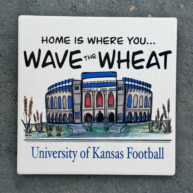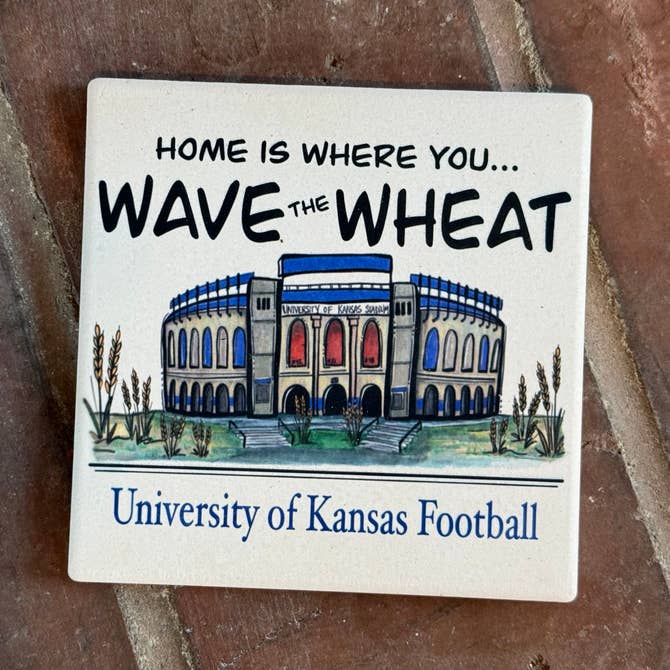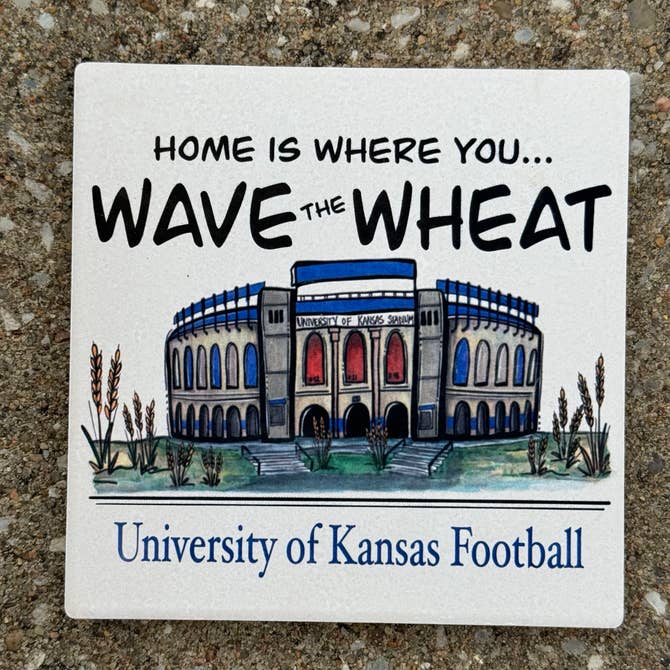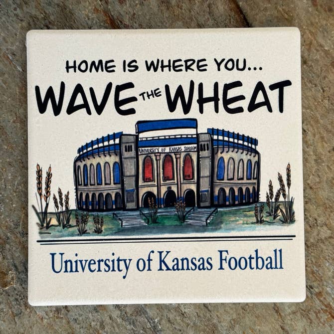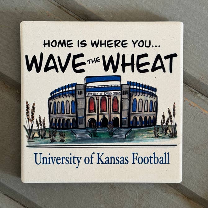 This absorbent stone coaster has been printed with my original watercolor painting of the University of Kansas Memorial Football Stadium. “Home is Where you Wave the Wheat” is across the top of the coaster with the words University of Kansas Football at the bottom. A full cork back will protect surfaces. Coasters are naturally absorbent. The artwork is permanent and will not fade or scratch. Coasters measure roughly 4”x4” Take a look at the matching coaster featuring Allen Fieldhouse. Designed and printed in Kansas.