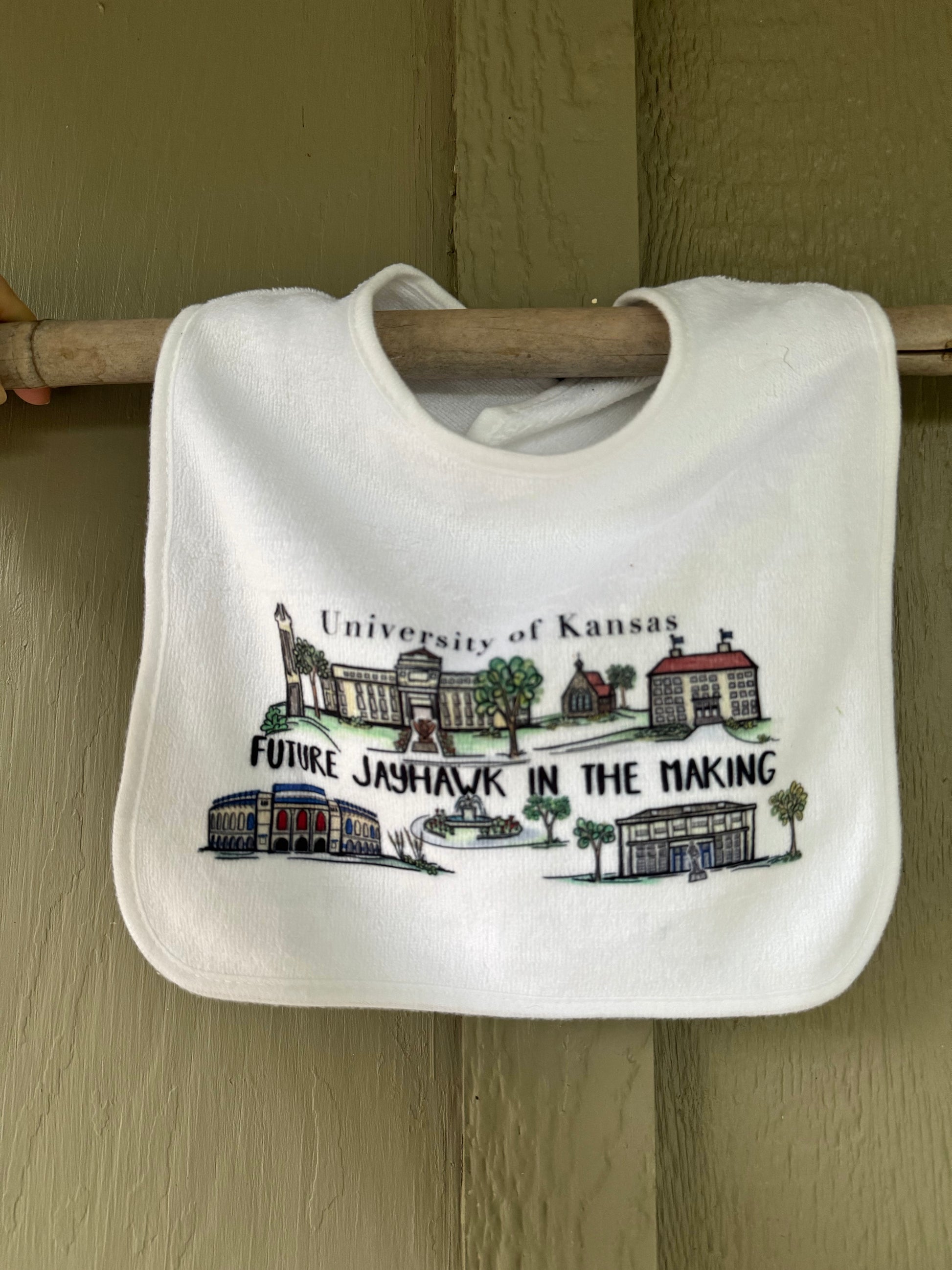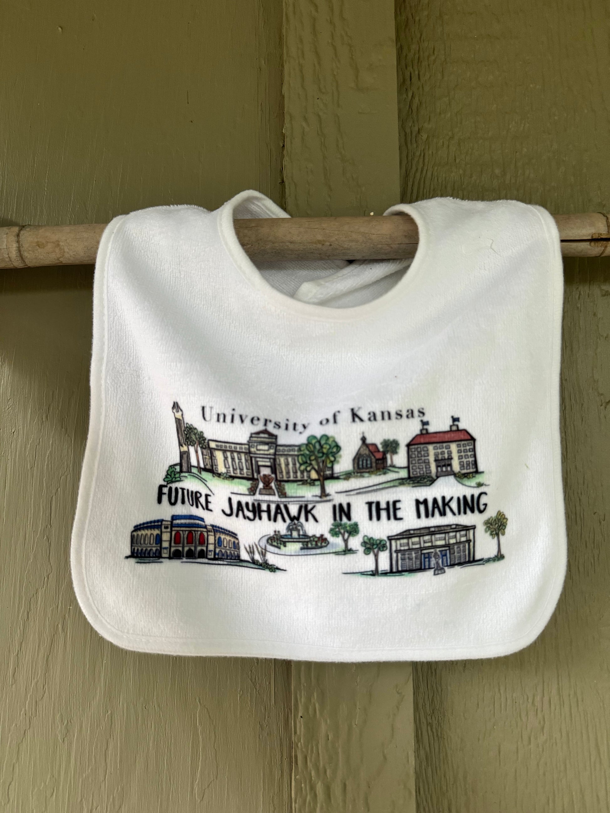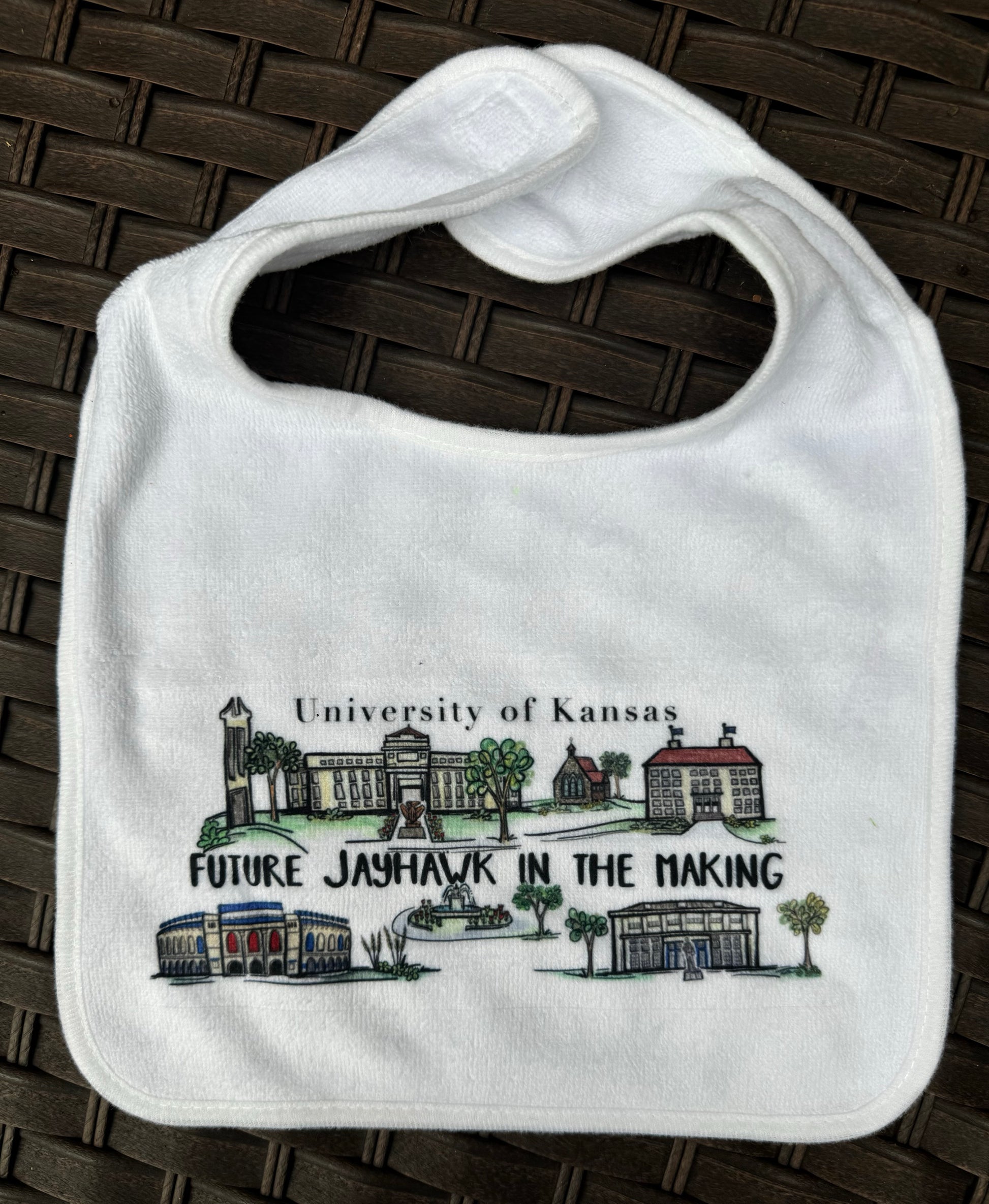 This incredibly soft, terry cloth baby bib is perfect for Jayhawk Fans. The bib is features a sketch including many of the buildings on the University of Kansas Campus. The words “ Future Jayhawk in the Making” stretch across the center of the map with the words University of Kansas across the top. The artwork includes some of the most iconic buildings from the top of the hill all the way to Allen Fieldhouse. Bib measures roughly 10” x 8” and has a Velcro closure in the back.