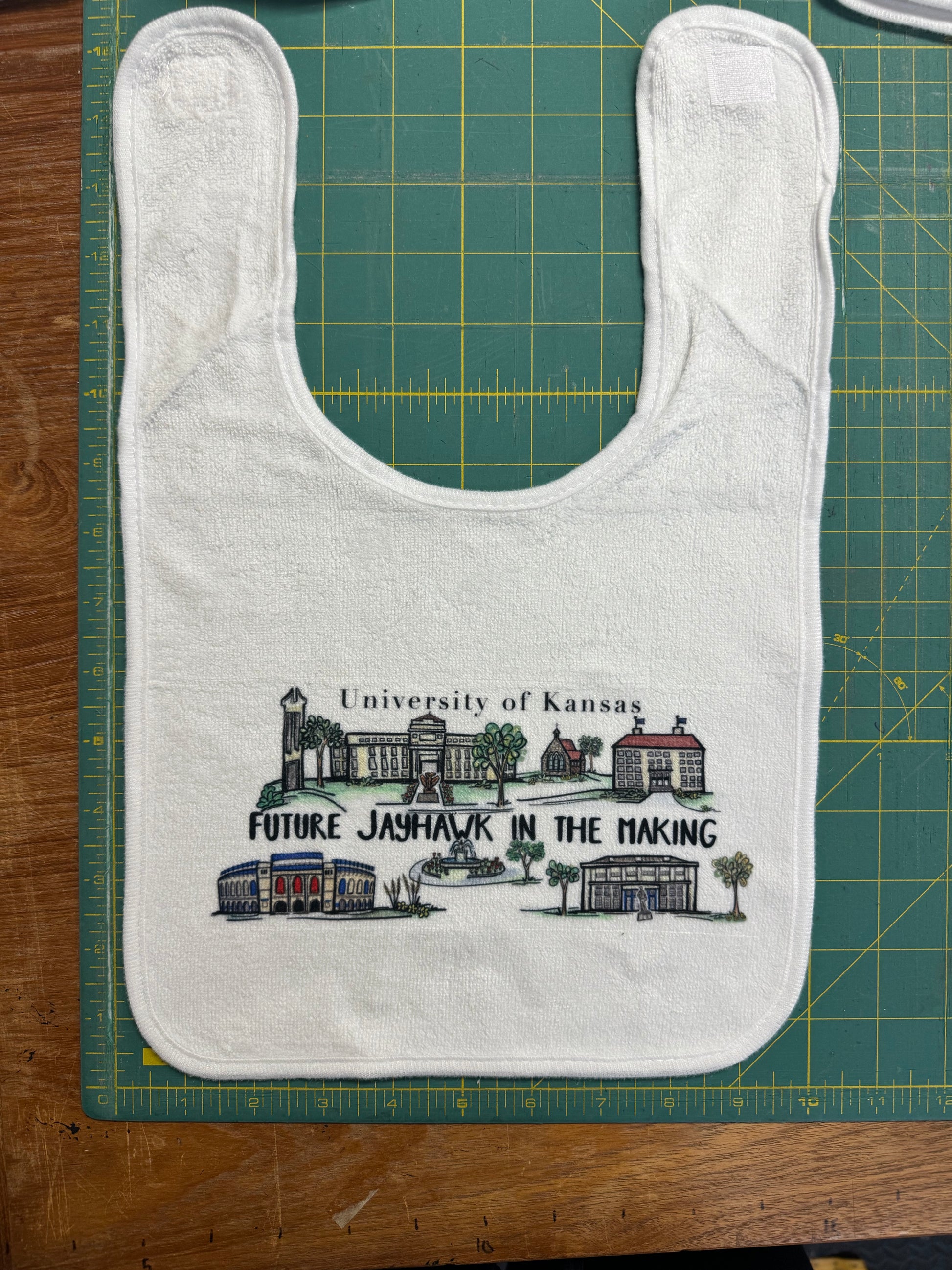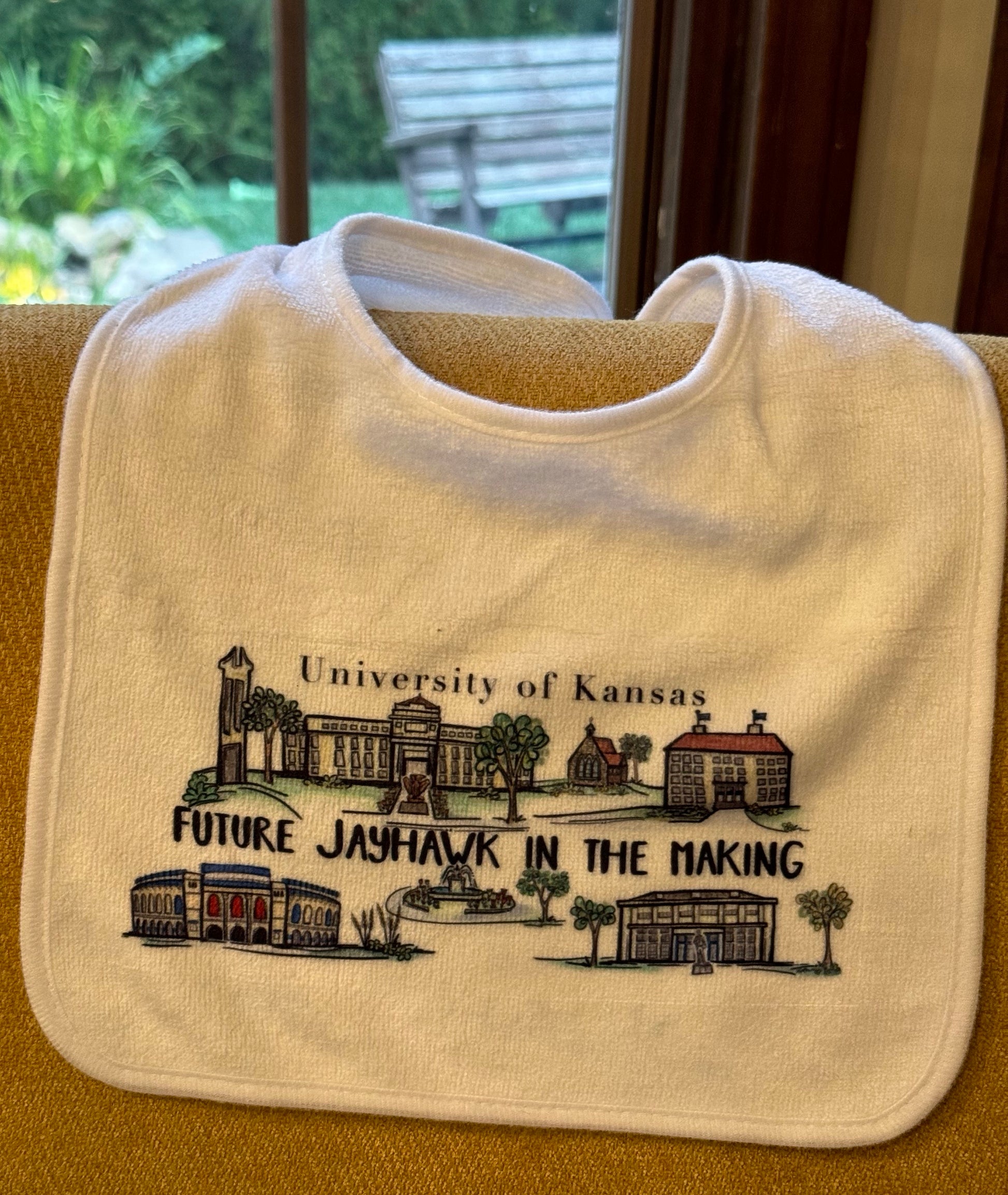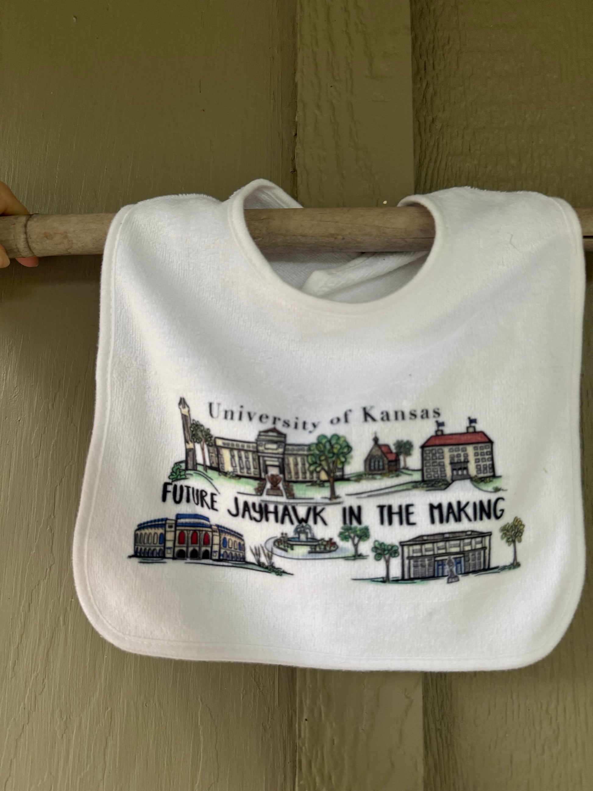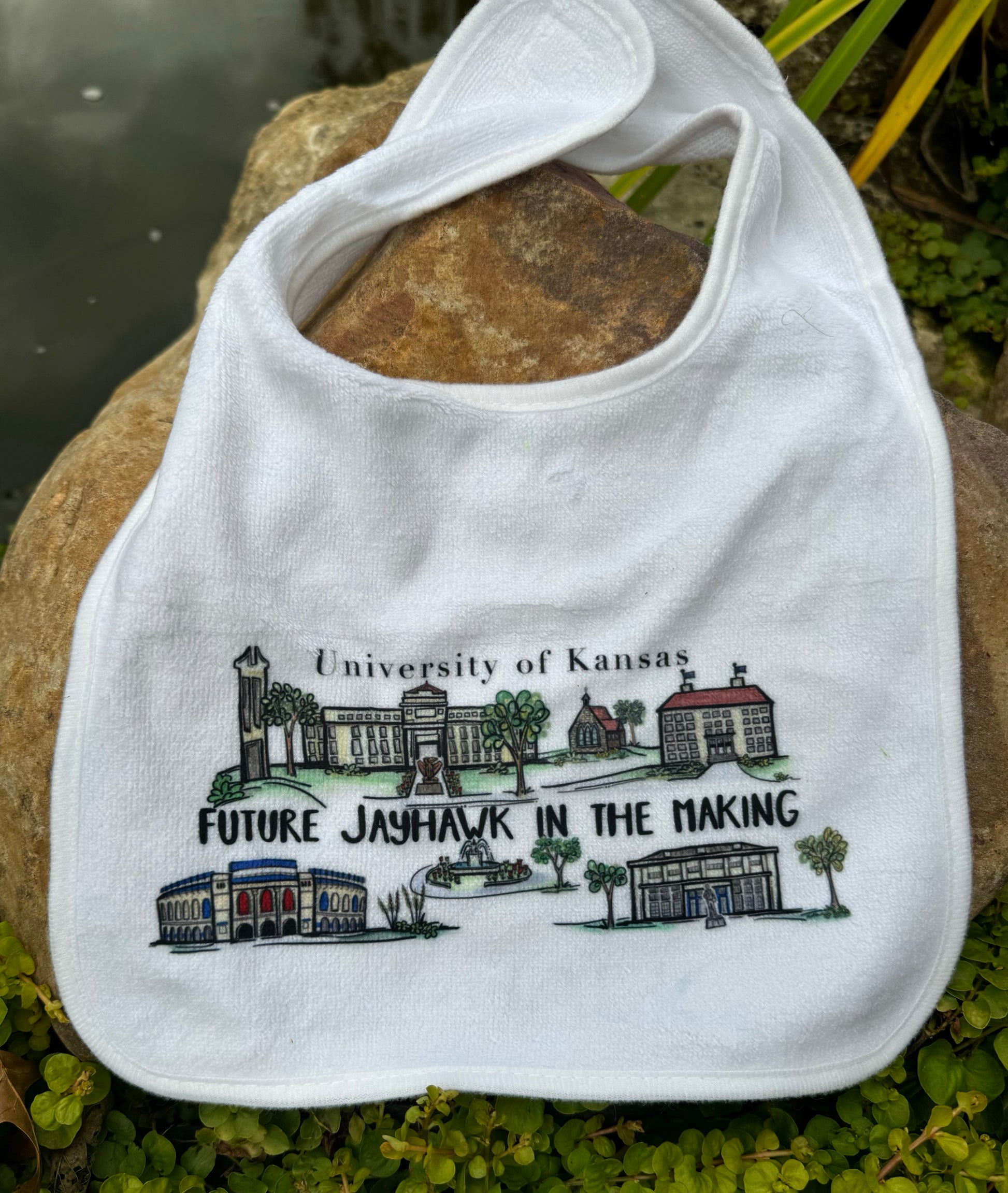 This incredibly soft, terry cloth baby bib is perfect for Jayhawk Fans. The bib is features a sketch including many of the buildings on the University of Kansas Campus. The words “ Future Jayhawk in the Making” stretch across the center of the map with the words University of Kansas across the top. The artwork includes some of the most iconic buildings from the top of the hill all the way to Allen Fieldhouse. Bib measures roughly 10” x 8” and has a Velcro closure in the back.