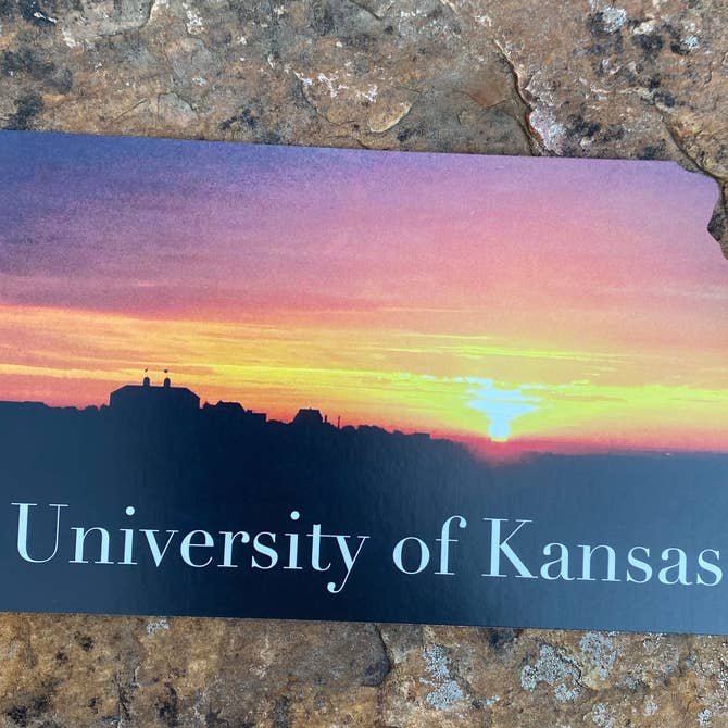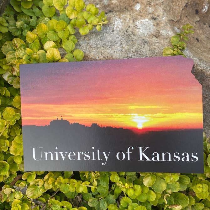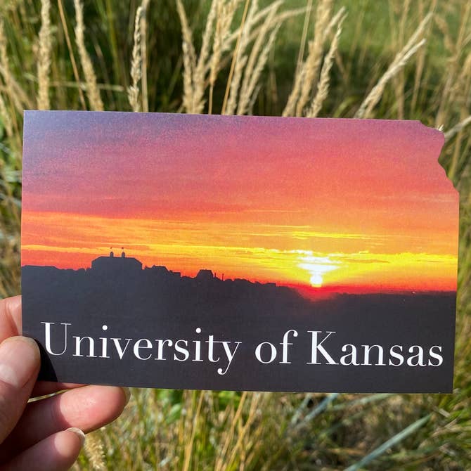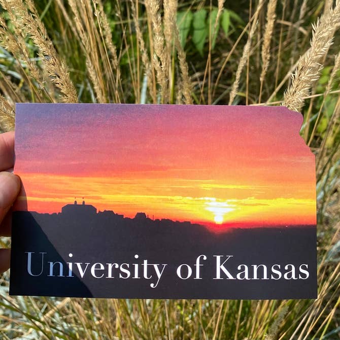 More than a basic postcard, this Kansas postcard is also die cut in the shape of Kansas. This photo was taken at sunrise capturing a beautiful silhouette of the University of Kansas campus skyline.