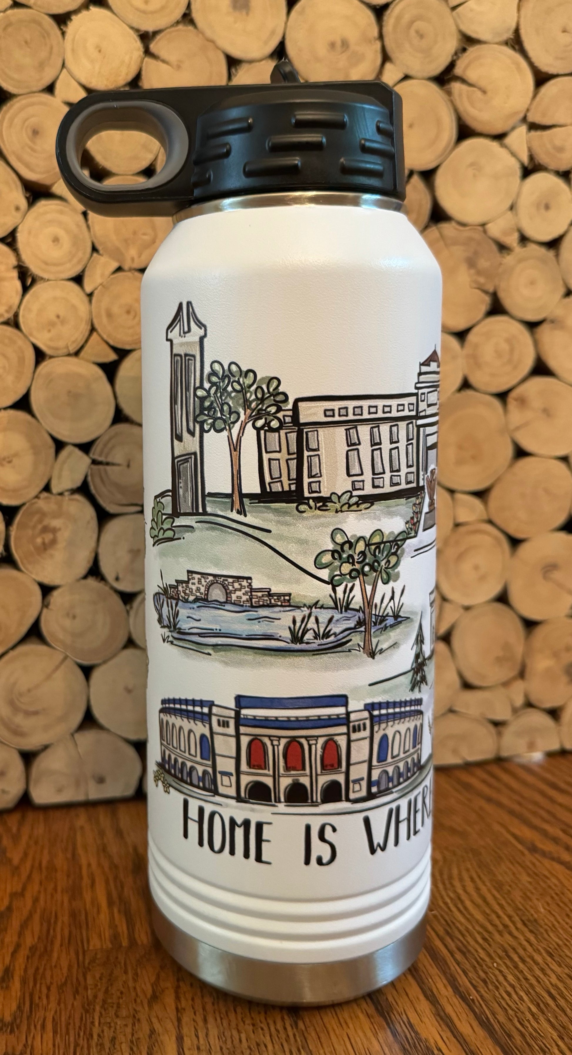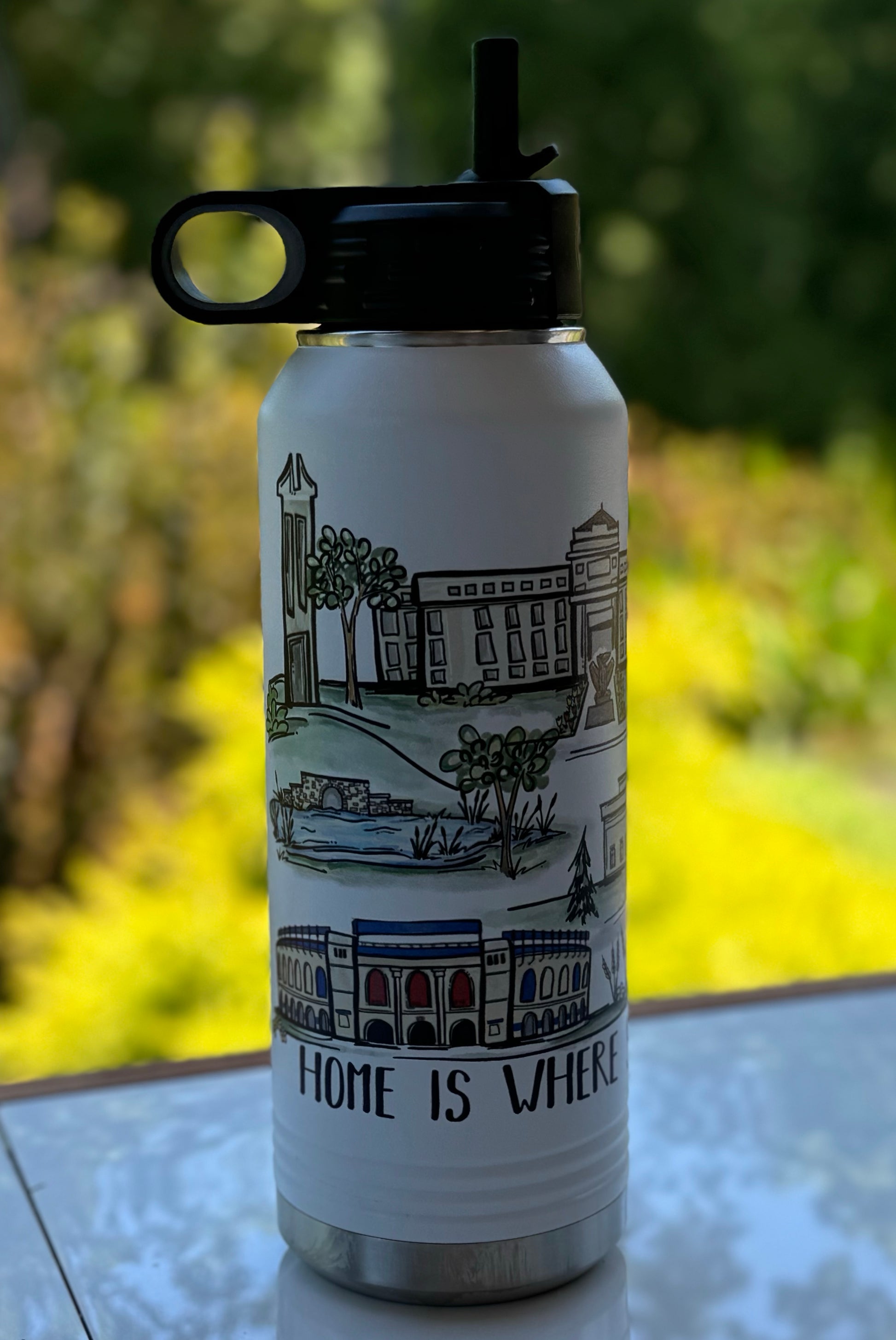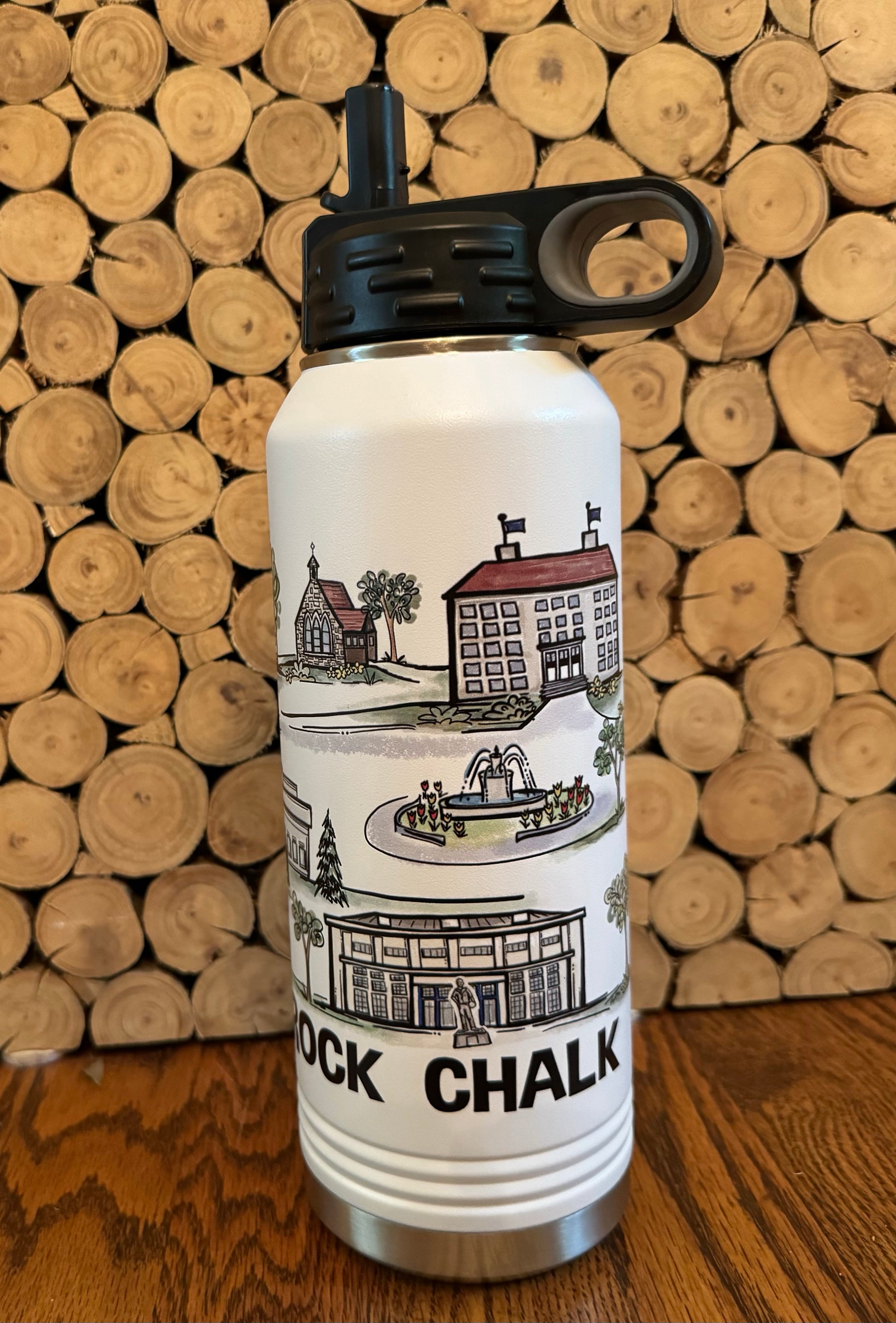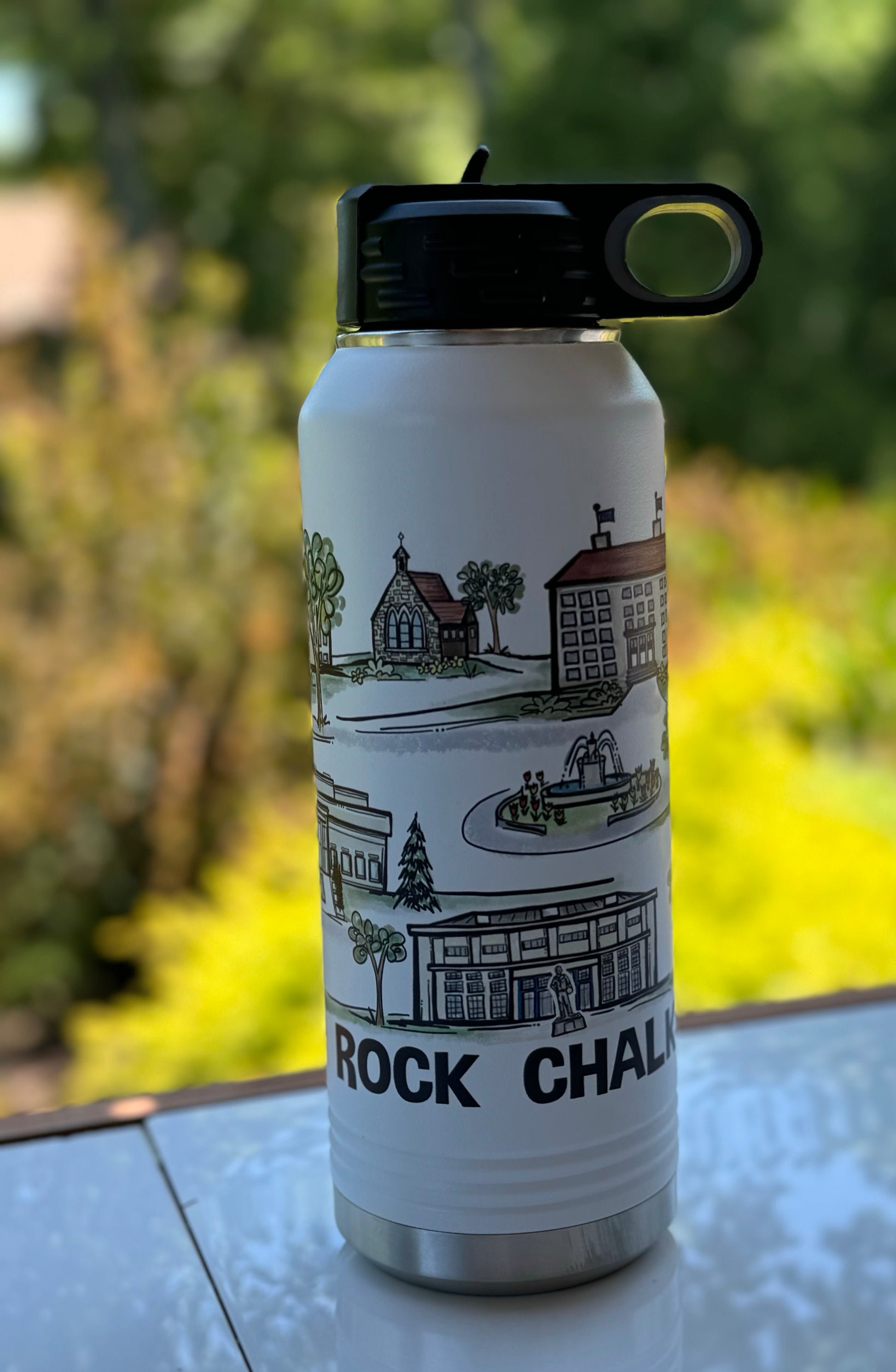 This 32oz polar Camel water bottle captures many of the most iconic locations around the University of Kansas Campus. My original watercolor sketch wraps completely around the bottle with the words “Home is where you Rock Chalk” across the bottom. The same watercolor art is also available in a canvas tote bag, and an 11"x 14" print.