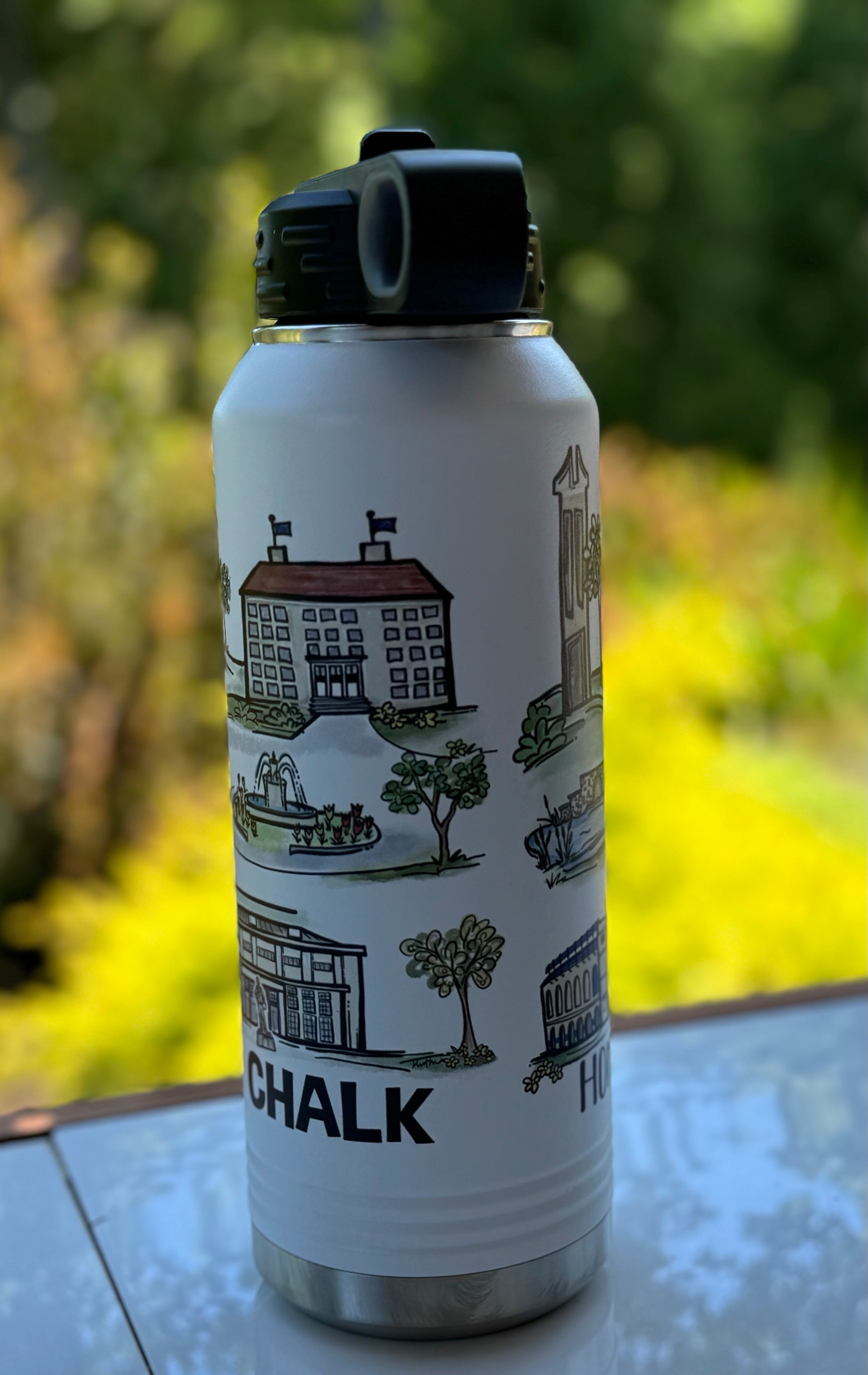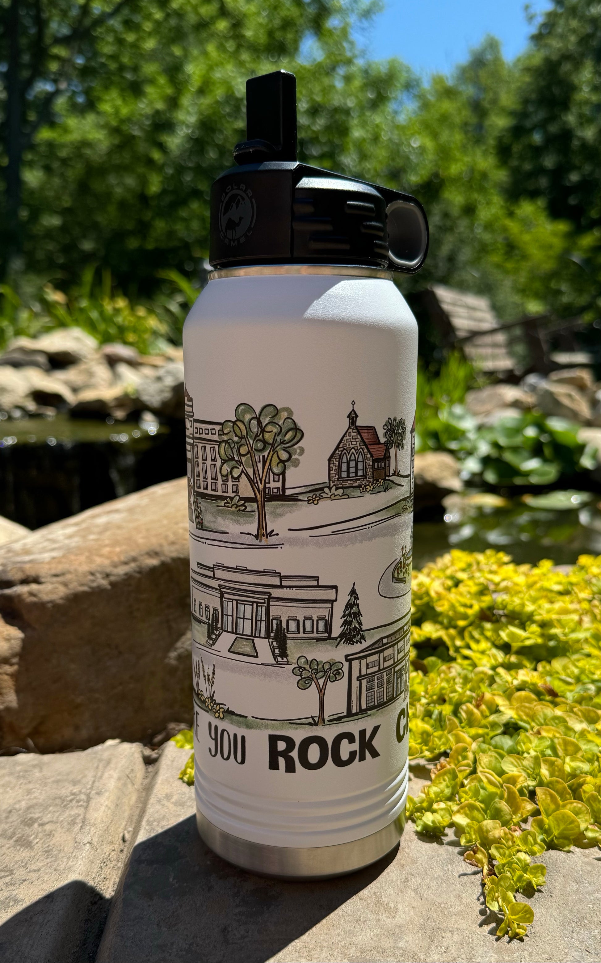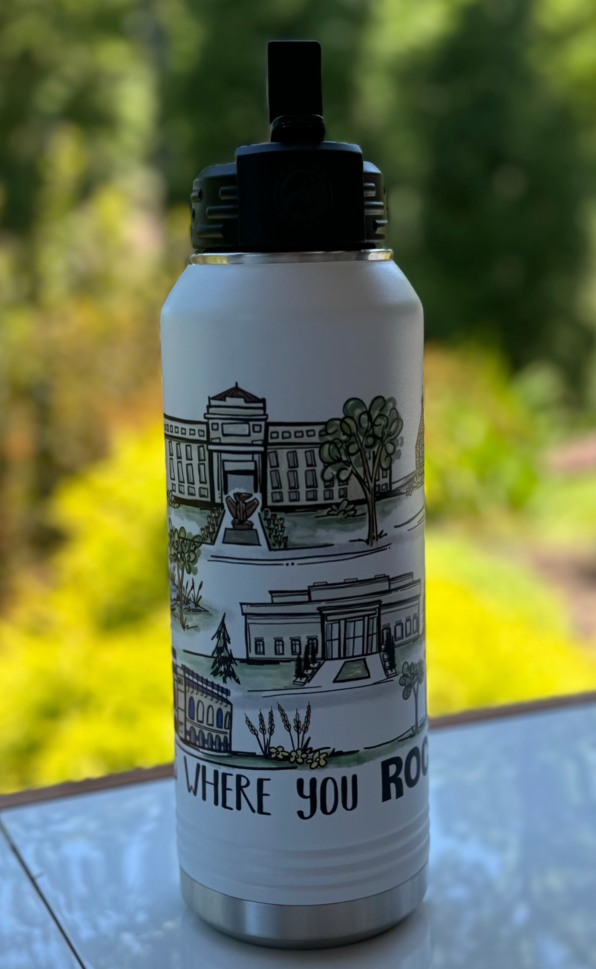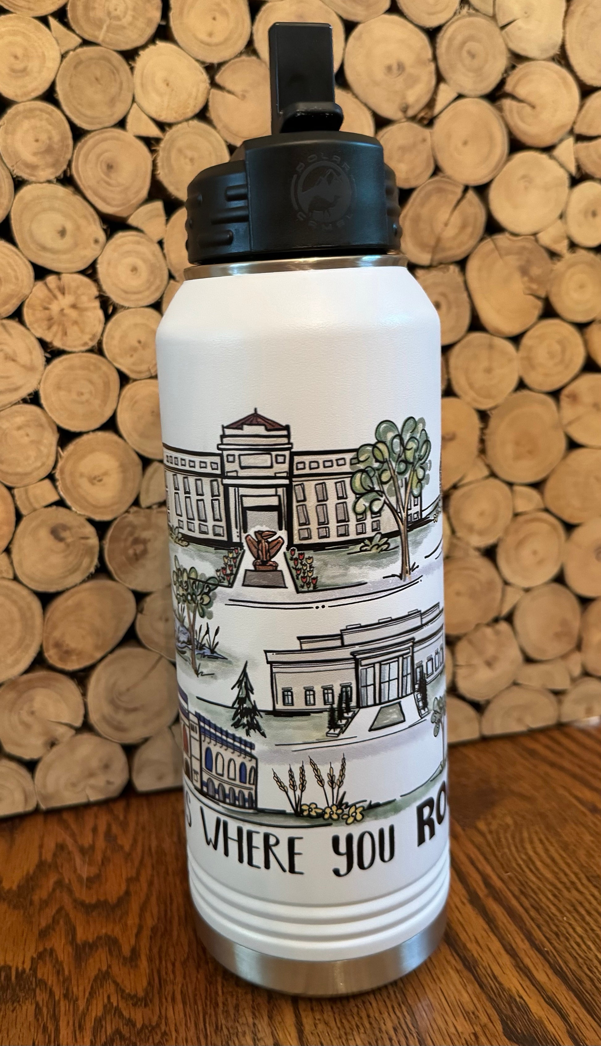 This 32oz polar Camel water bottle captures many of the most iconic locations around the University of Kansas Campus. My original watercolor sketch wraps completely around the bottle with the words “Home is where you Rock Chalk” across the bottom. The same watercolor art is also available in a canvas tote bag, and an 11"x 14" print.