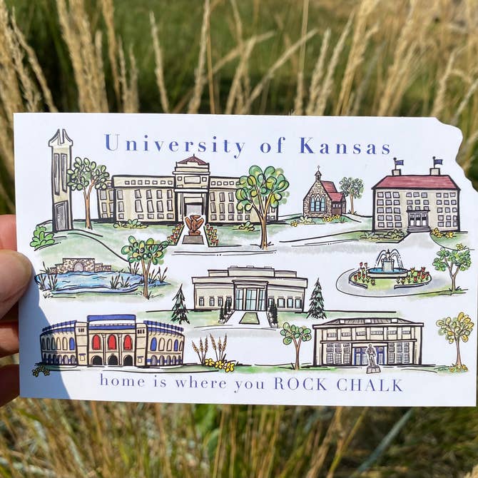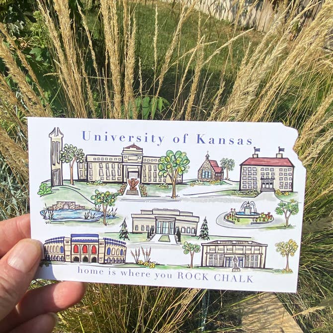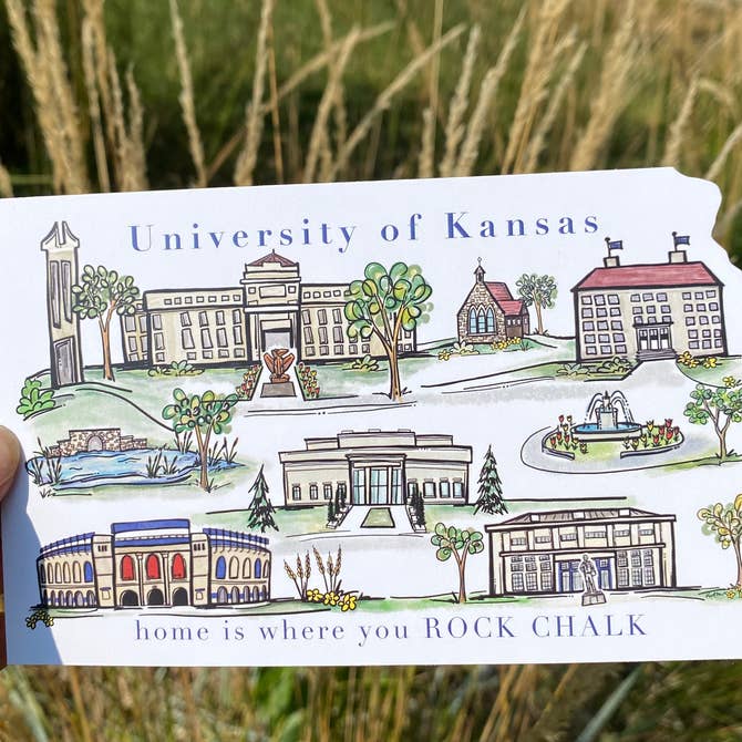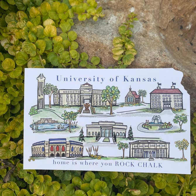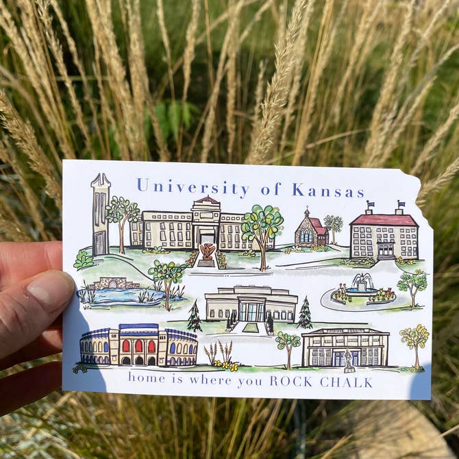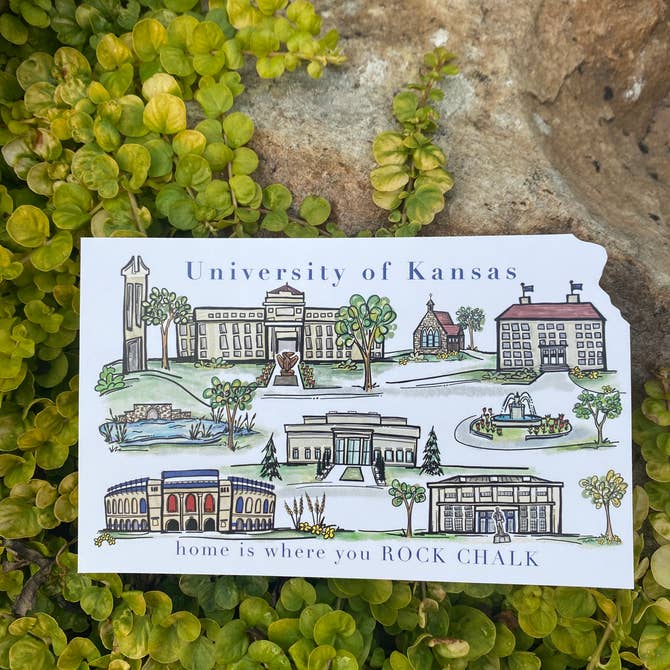 More than a basic postcard, this Kansas postcard is also die cut in the shape of Kansas. This postcard design features many of the most iconic sites around the University of Kansas campus from the flags on Fraser Hall to Allen Fieldhouse. Send a bit of KU love across the country with this cheerful watercolor design.