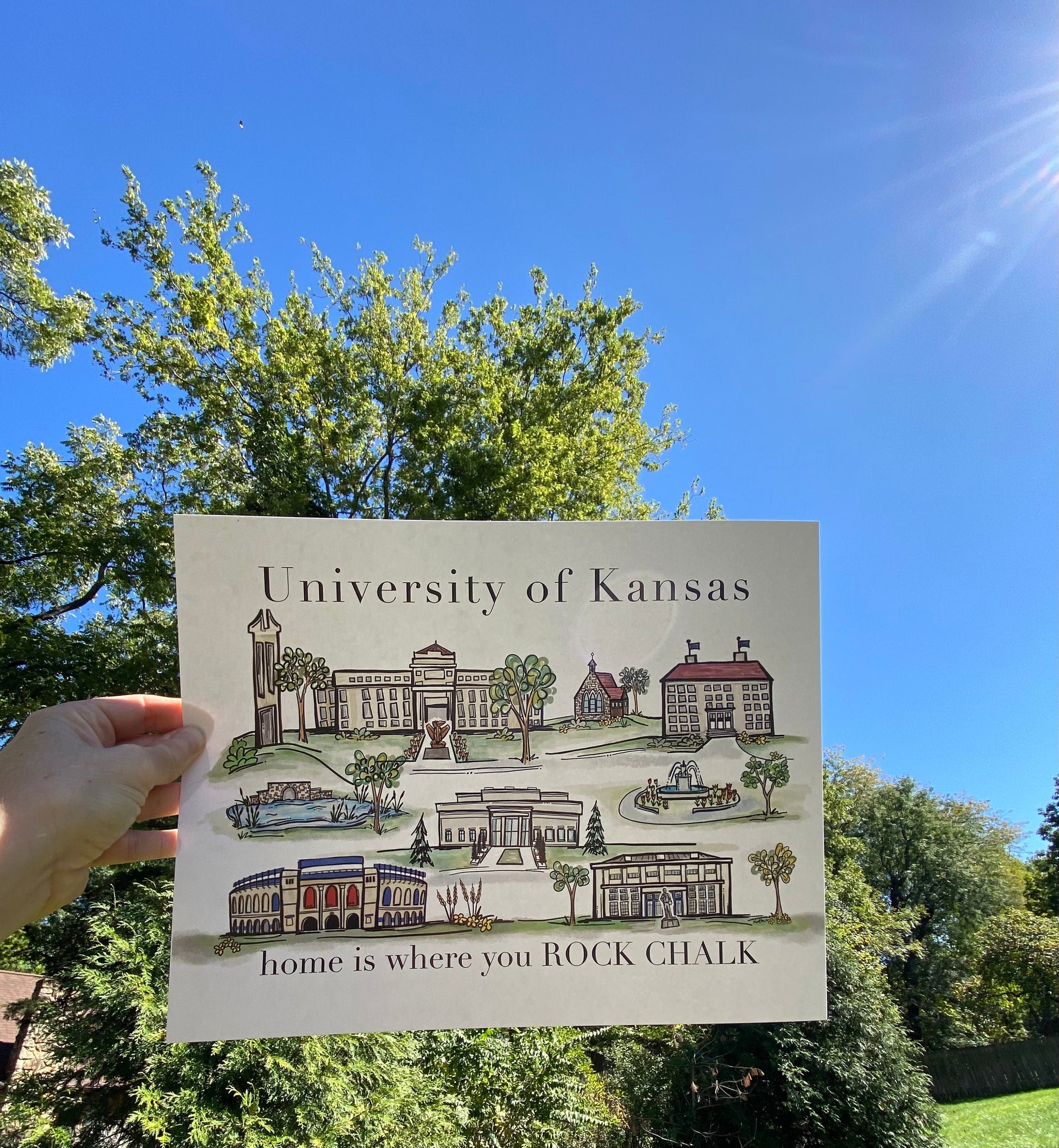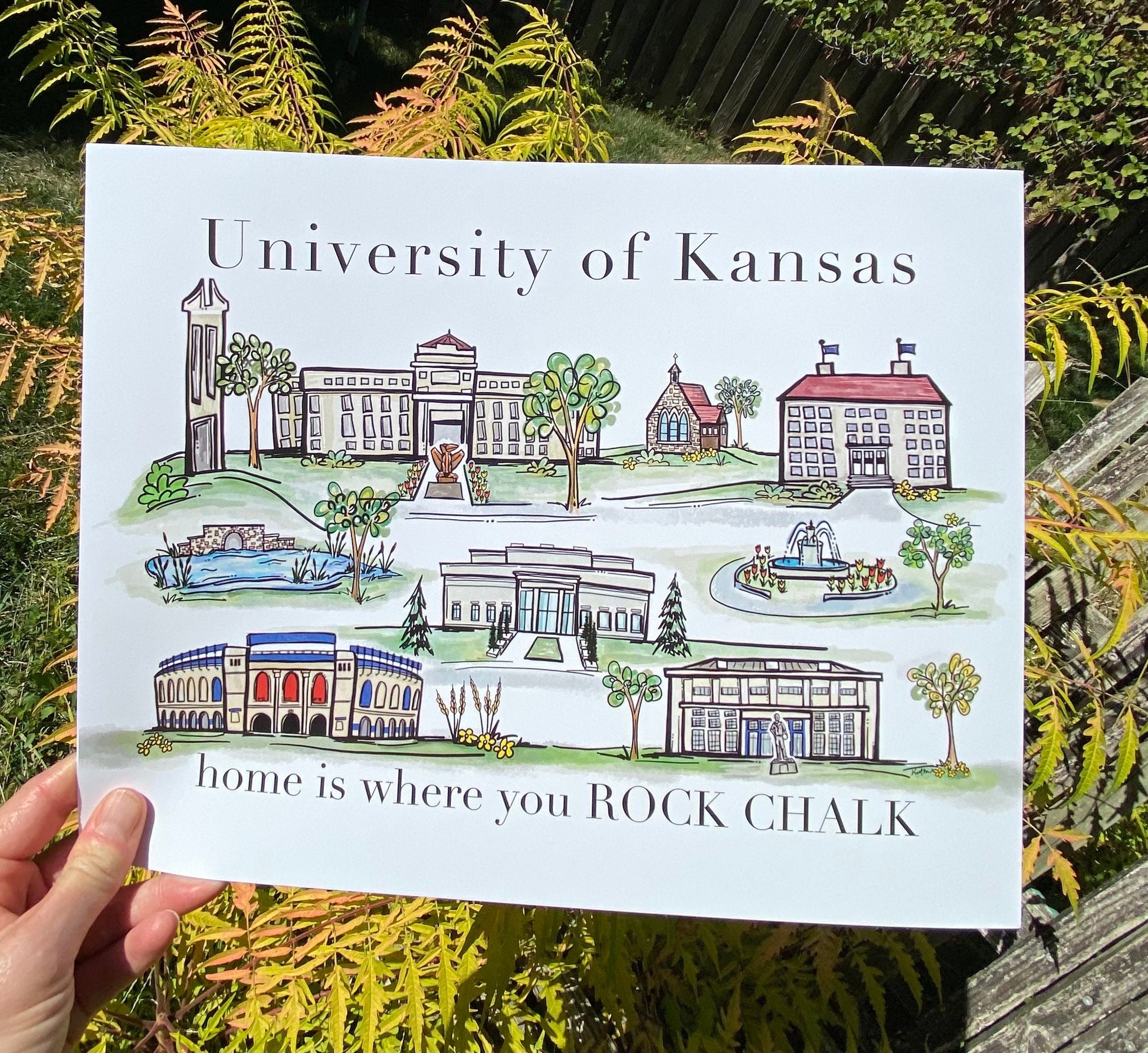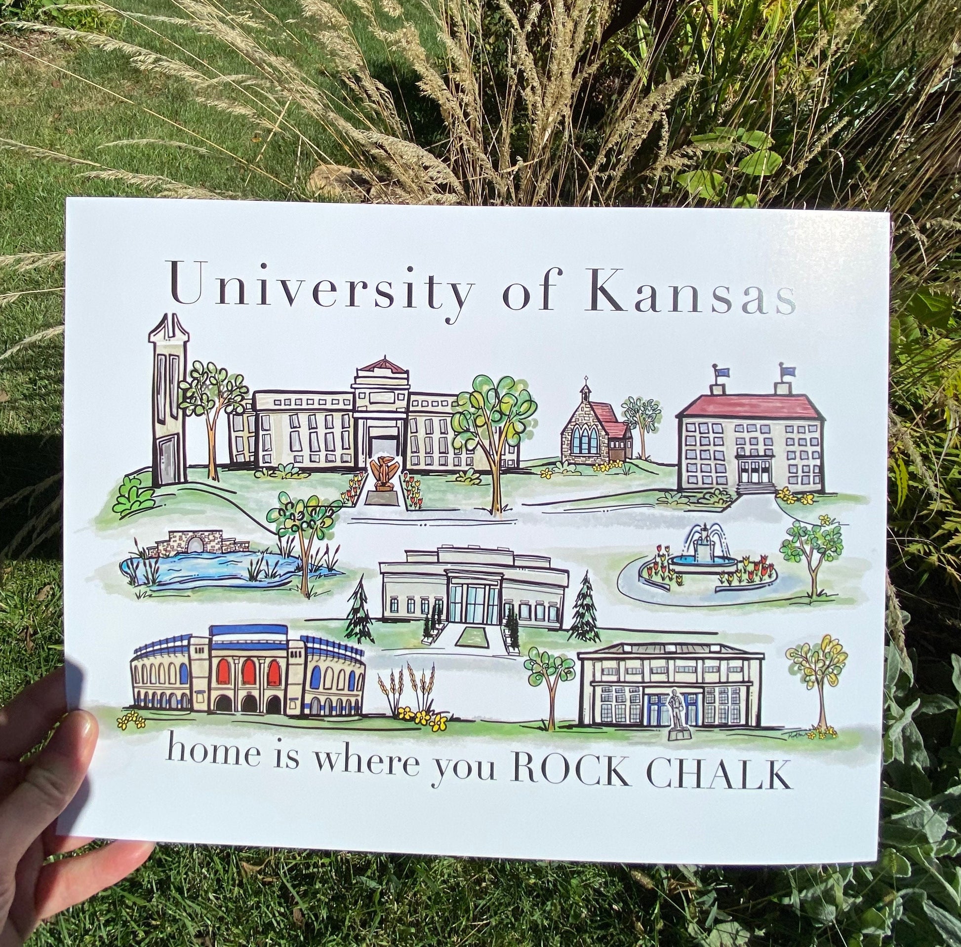 This original watercolor has been professionally printed on 11"x14" paper and is ready to frame. The painting features some of the most iconic locations on The University of Kansas campus- from Fraser Hall to Allen Fieldhouse and Memorial Stadium. The simplicity of the painting makes it a perfect complement to any home or office decor.