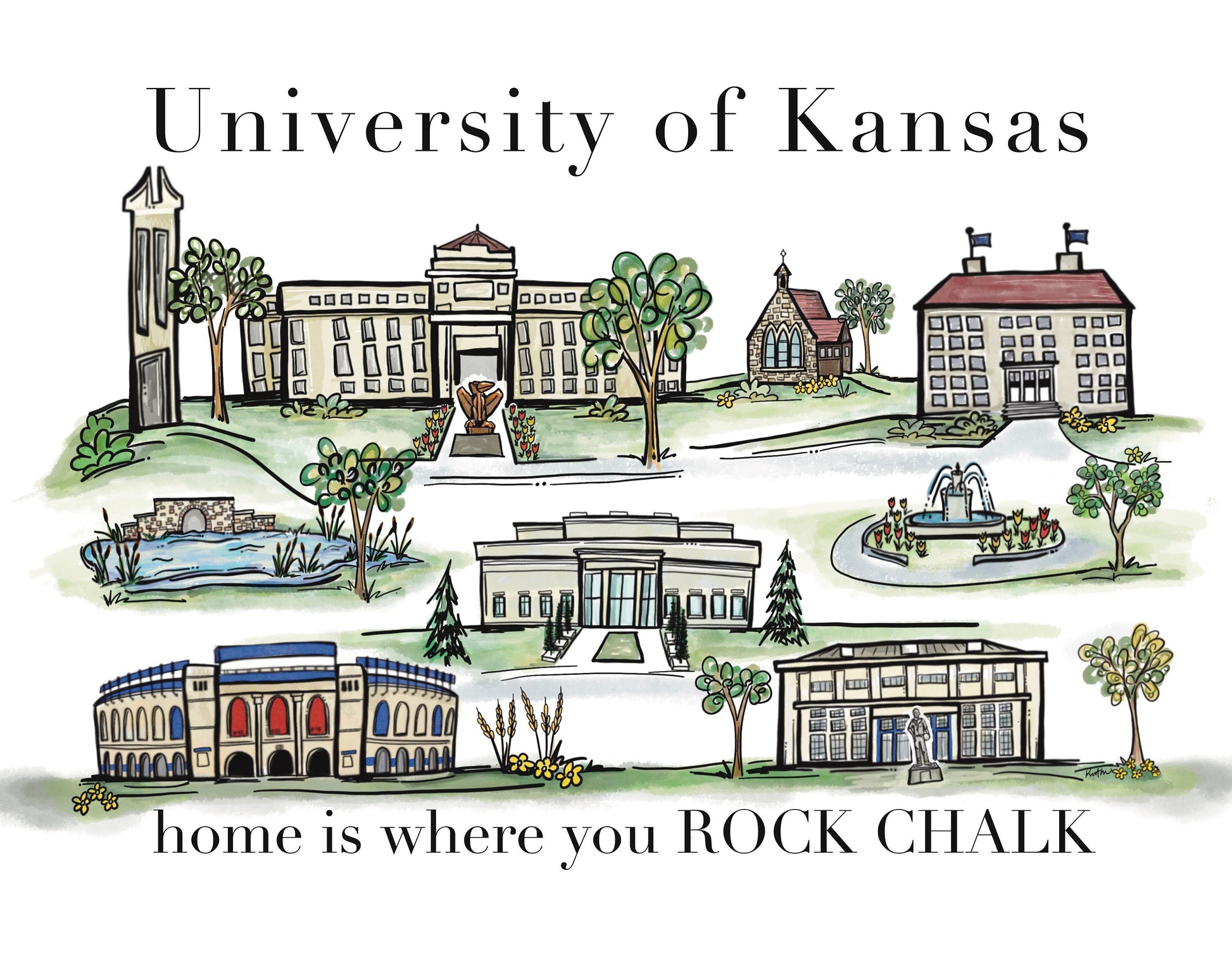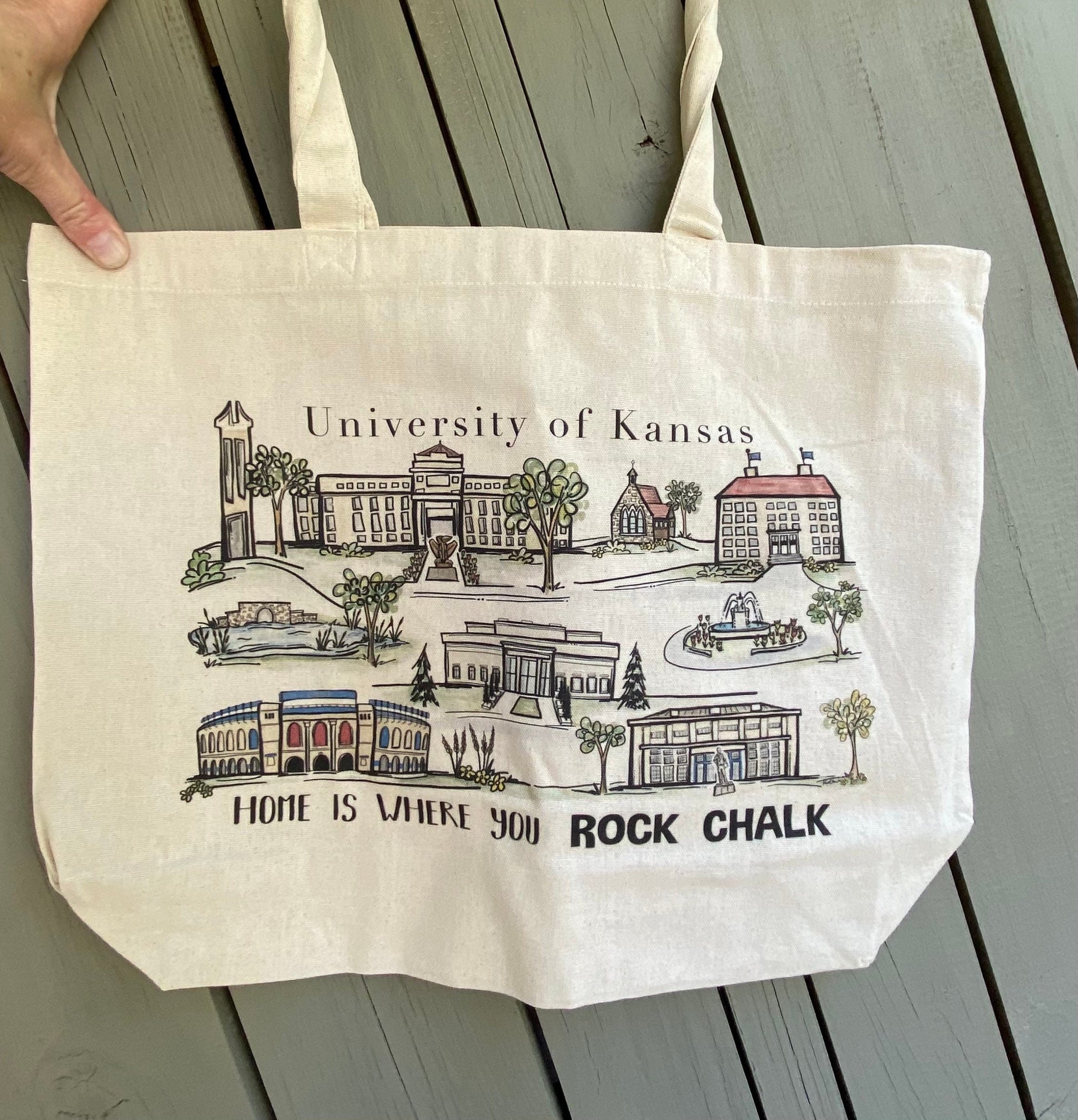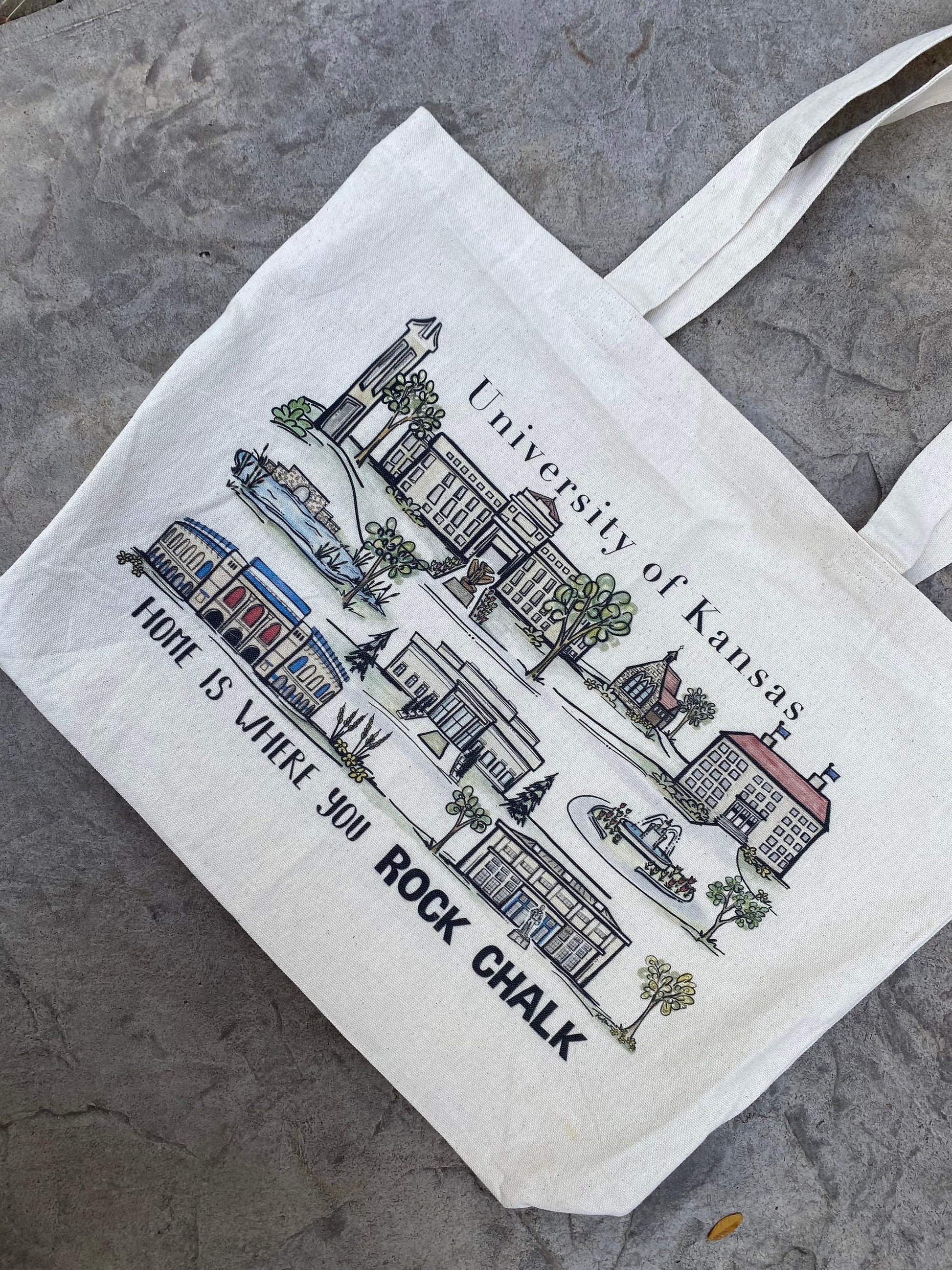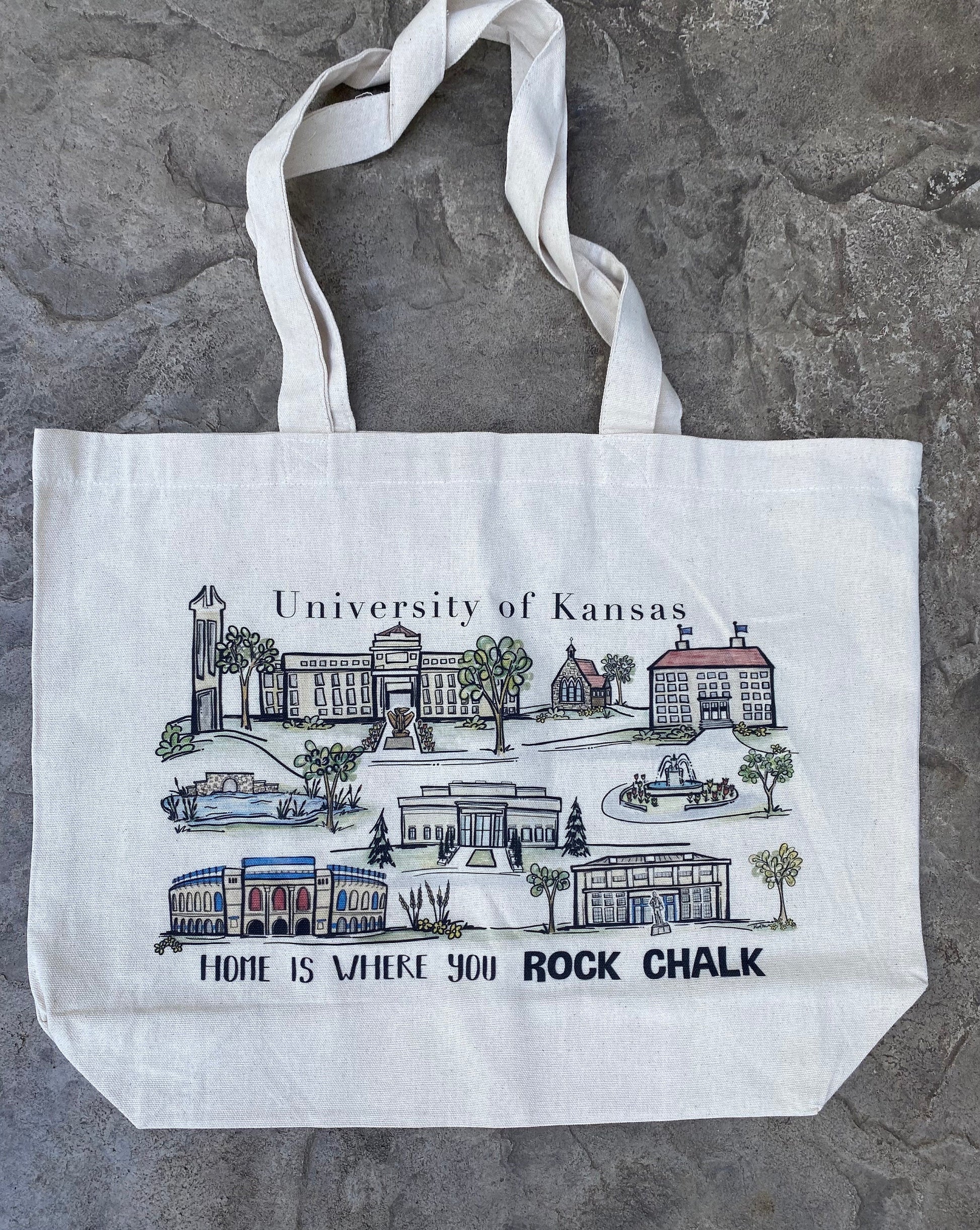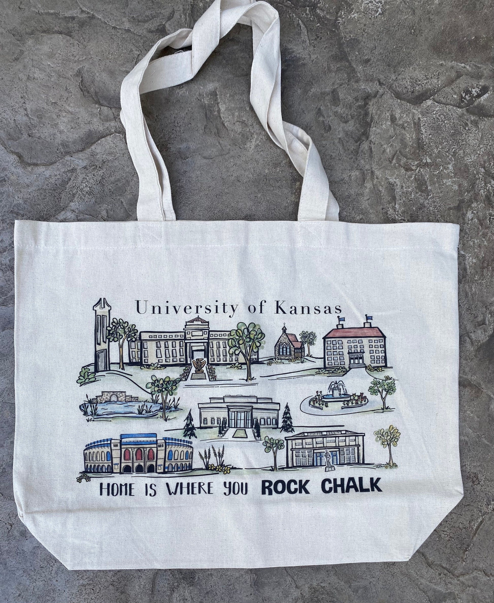 This heavy canvas tote bag has been professionally printed with my original watercolor painting of the University of Kansas Campus. The artwork features some of the most iconic locations around campus with the words “home is where you Rock Chalk” across the bottom. A fun gift option or Kansas keepsake. The tote bag measures about 13” x 19” and has strong woven handles and a 3” gusset bottom.