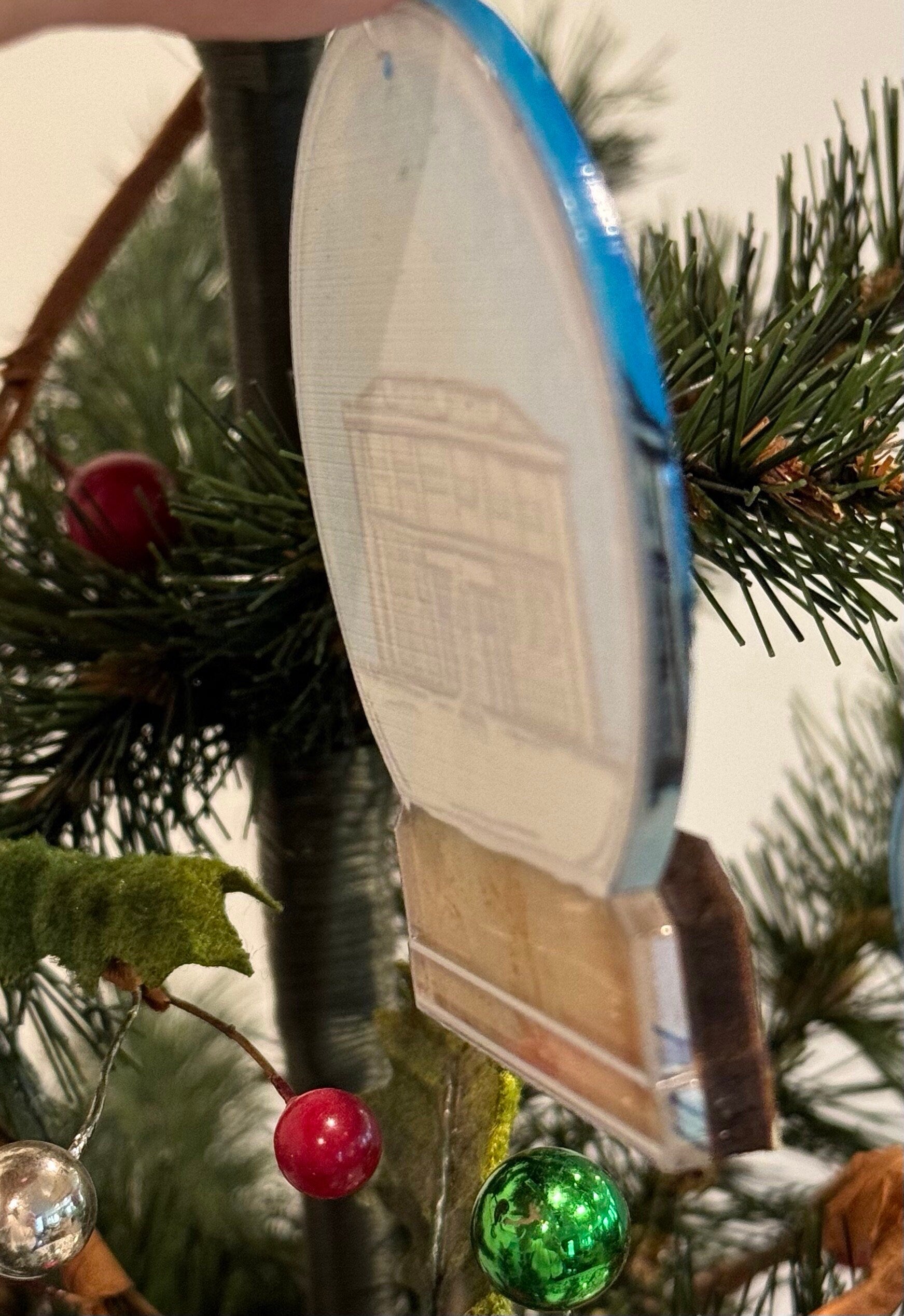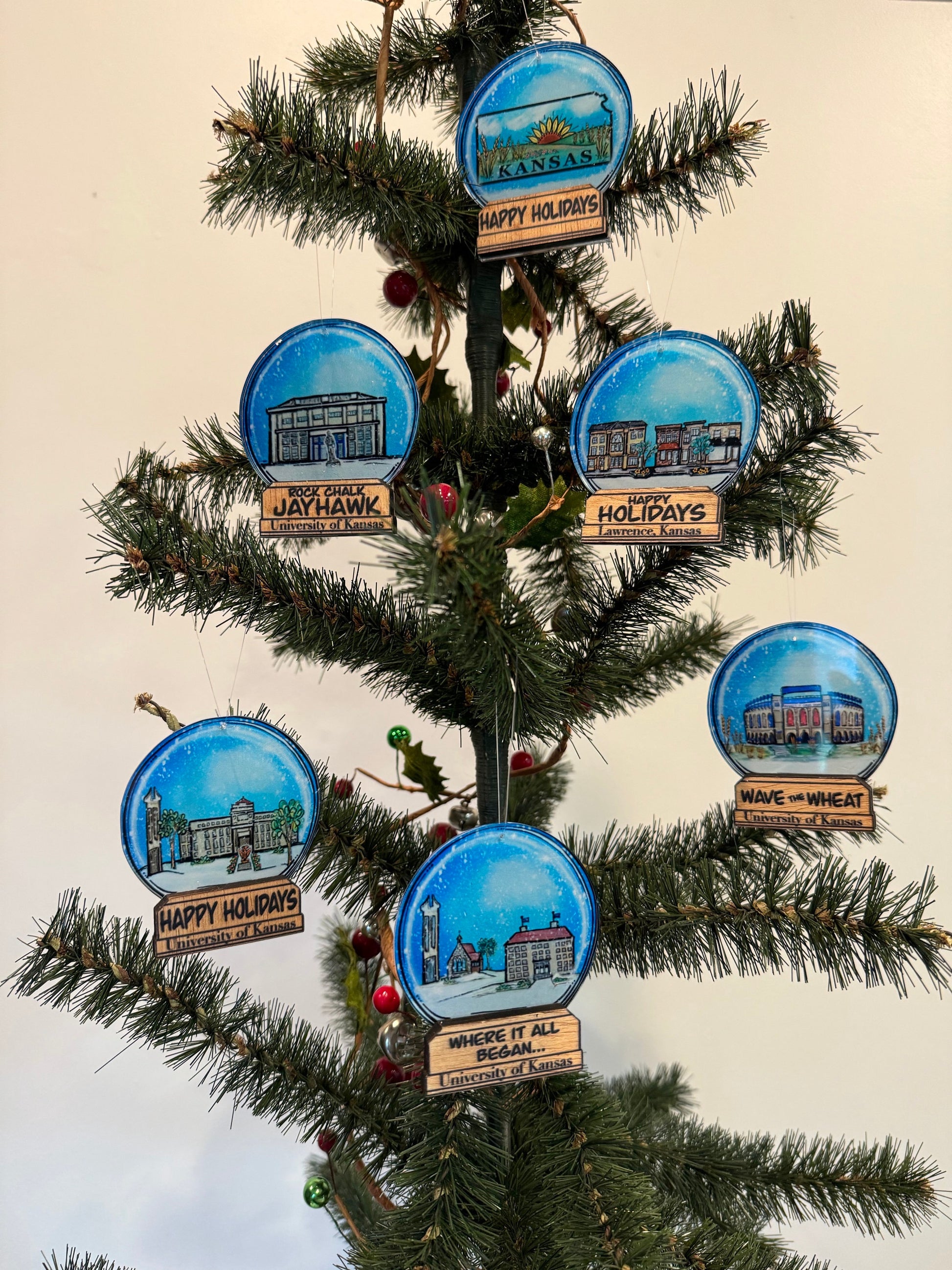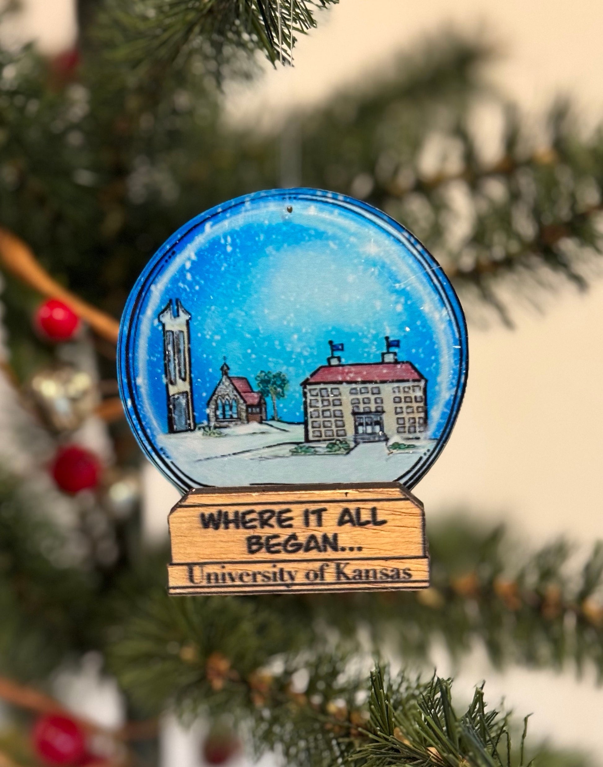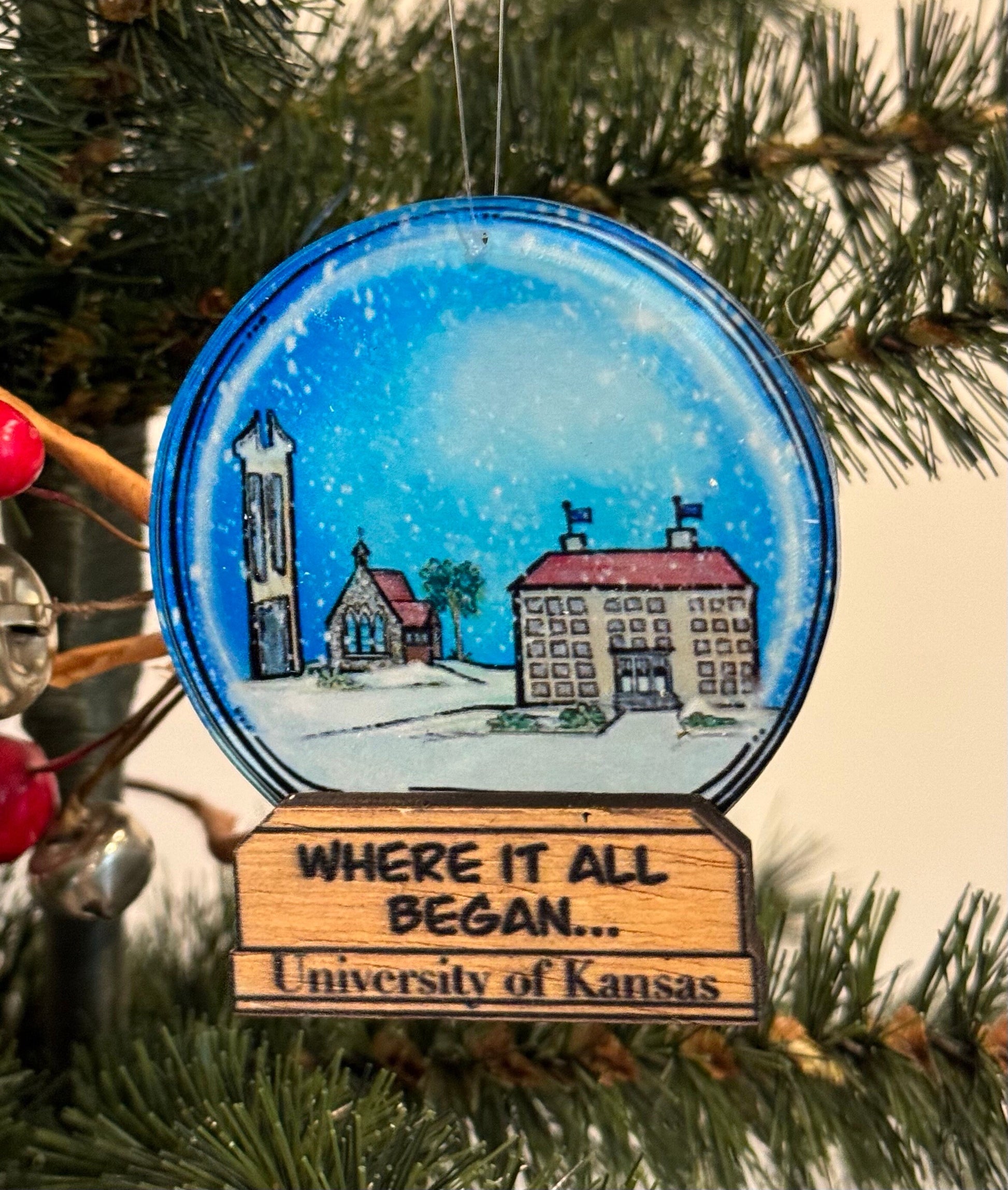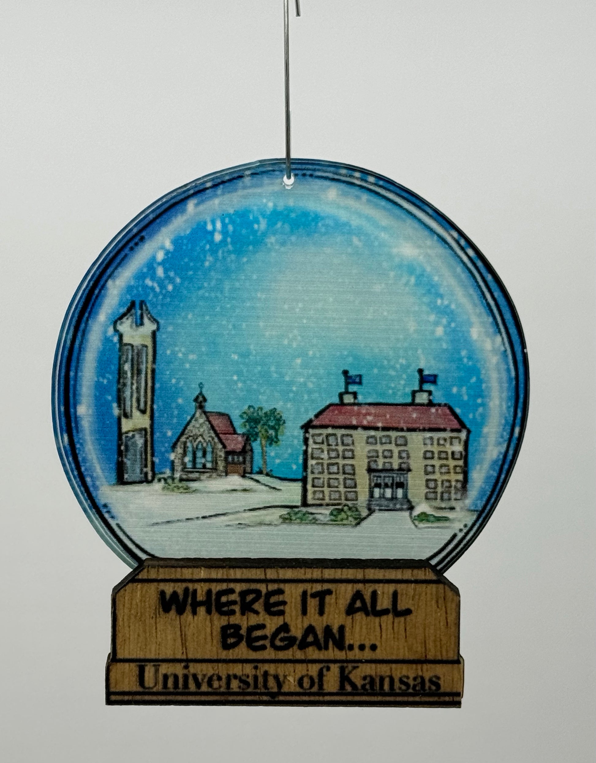 This beautiful ornament is made from acrylic and wood and looks just like a snow globe. Inside the snow globe is a watercolor sketch of the Campanile, Danforth Chapel, and Fraser. On the wood base of the ornament are the words "Where it all began… University of Kansas." This is a perfect keepsake for those who met on campus or to share a little holiday Jayhawk love. The ornament is 3” tall and almost 3” wide. The acrylic piece has been professionally laser printed with my original art and allows a bit of light through while hanging on a tree. There are 4 other University of Kansas snow globe ornaments available for a beautiful tree display.