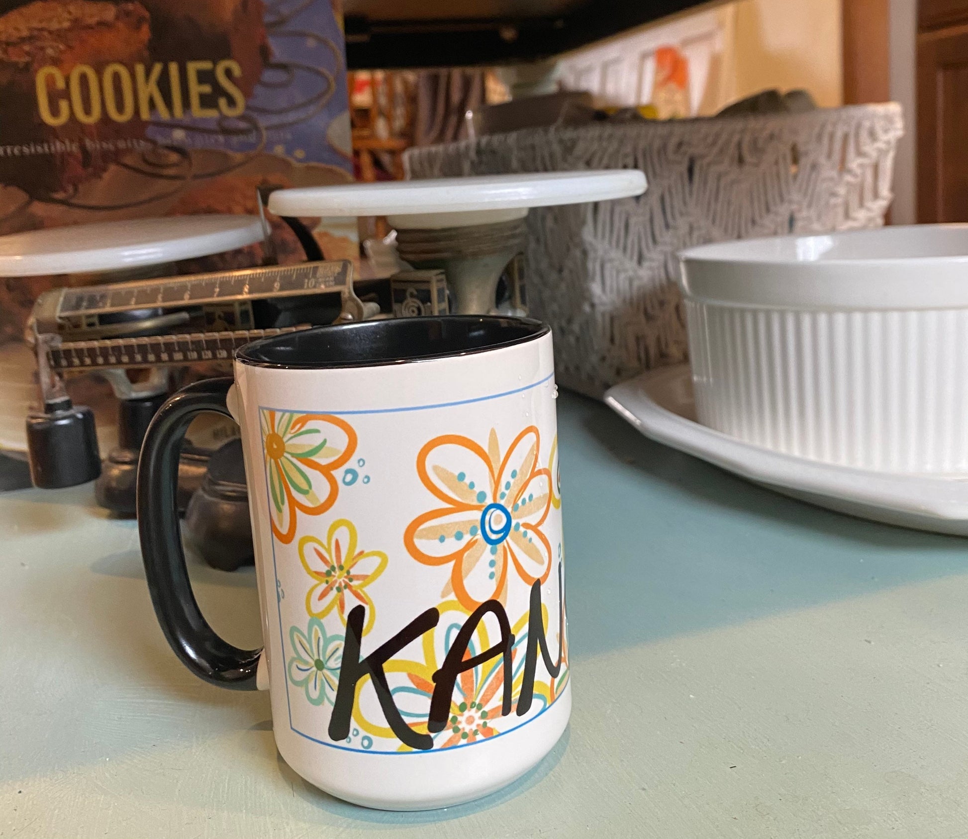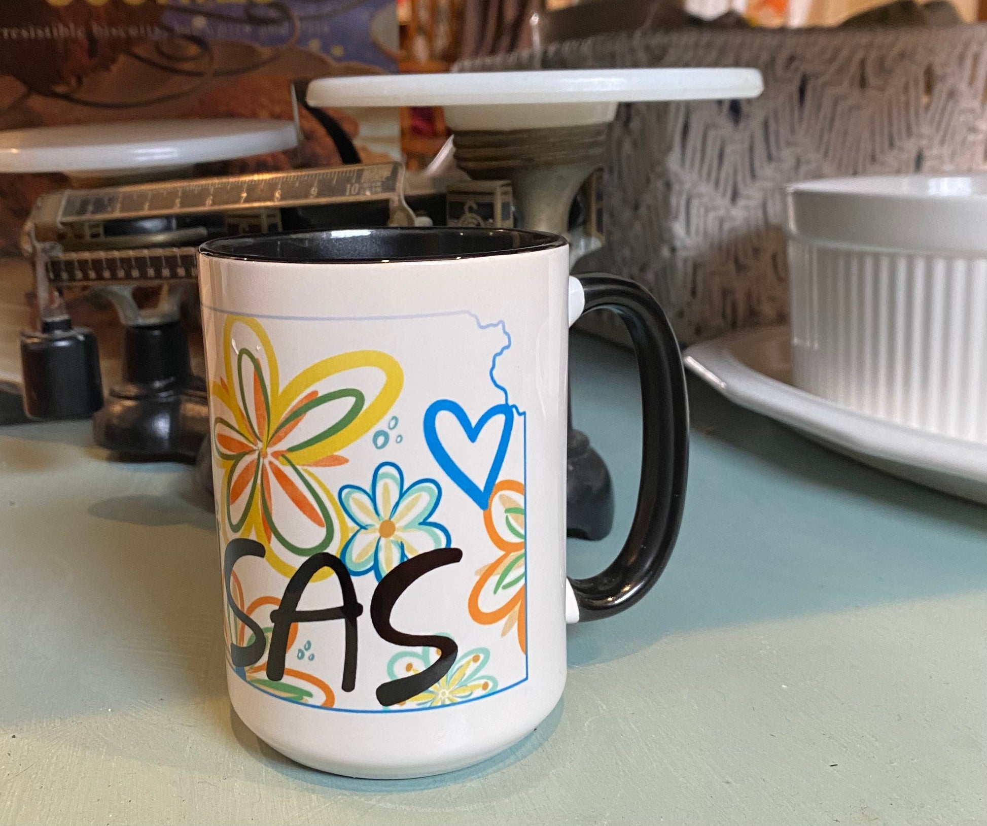 This 15 fl oz mug has been sublimated with my original happy Kansas Flowers. An open heart falls over the area from Topeka- Kansas City. A fun gift for a new home, graduation or wedding. Mugs are dishwasher and microwave safe-the image is permanent and will not fade over time. A sticker with my product info and instructions will be on the bottom of each mug